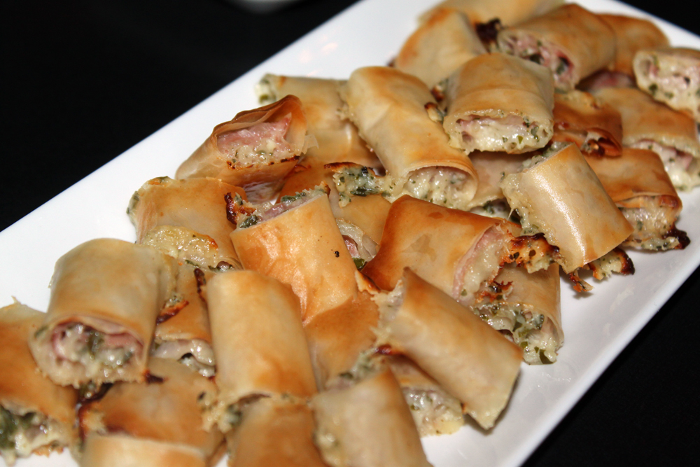 - Lägg 2 bitar parmaskinka längs med den ena långsidan på ett ark filodeg. Bre ut lite av fyllningen på skinkan. Rulla samman filodegen från långsidan, som en rulltårta. Fäst skarven med lite smält matfett. Jag använder alltid flytande margarin. Pensla även ovansidan med matfett för att de ska få en fin färg.