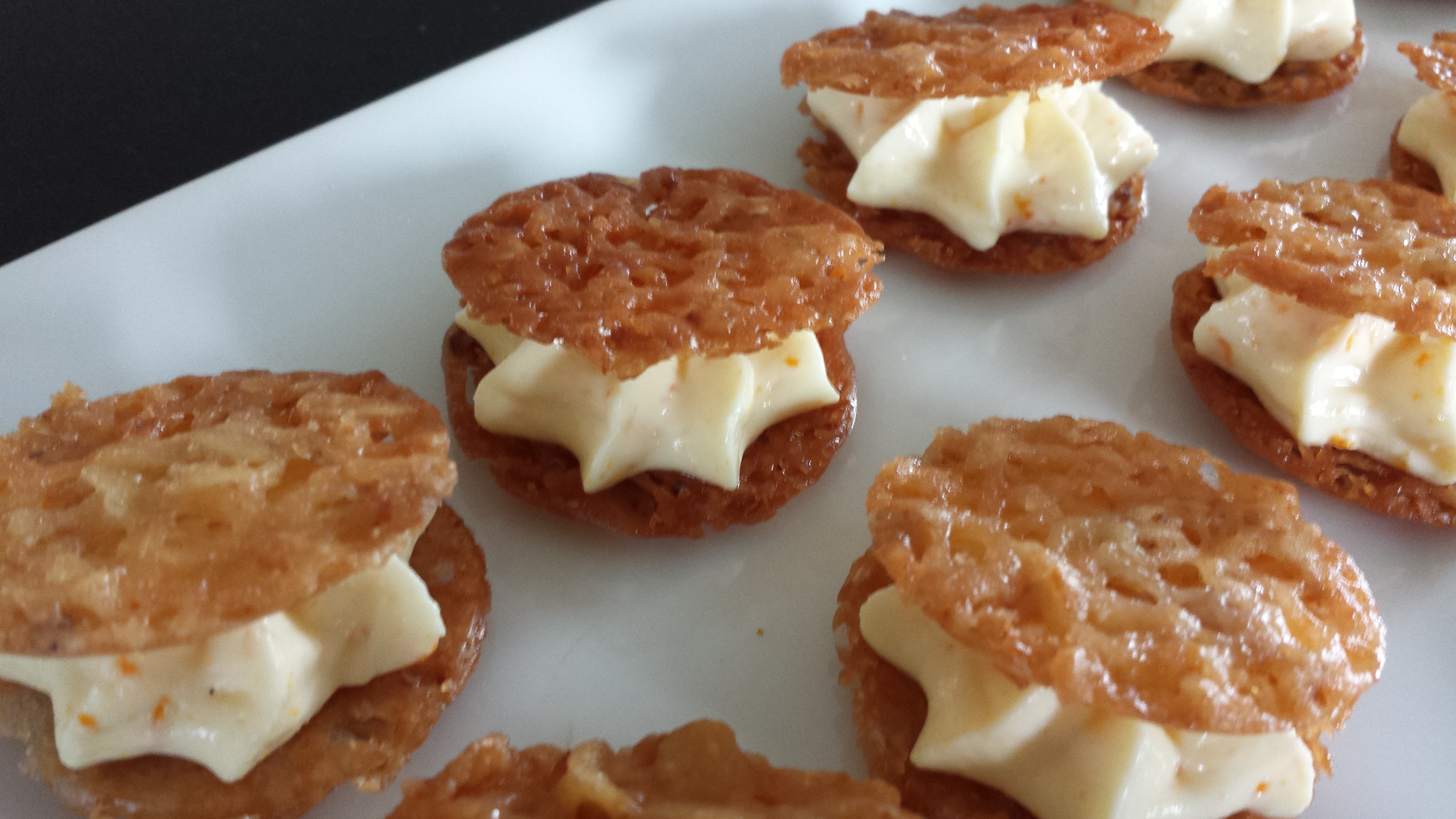 - Bre eller spritsa ut fyllningen försiktigt på hälften av kakorna. Lägg ihop dem två och två.