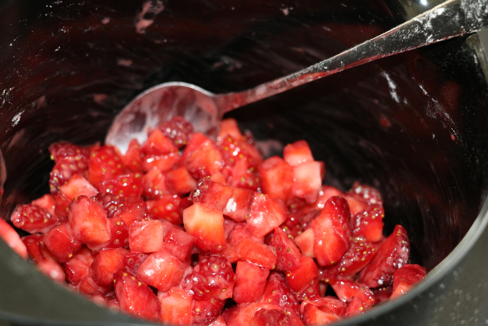 - Dela jordgubbarna i mindre bitar. Blanda med potatismjölet.