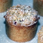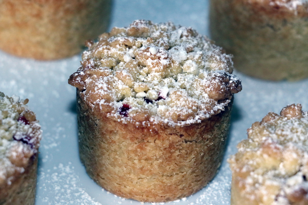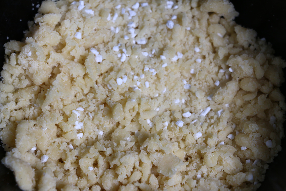 - Ta fram den lilla degbiten och arbeta in vetemjöl, pärlsocker och vaniljsocker till en smulig massa. Strö smulorna över formarna.