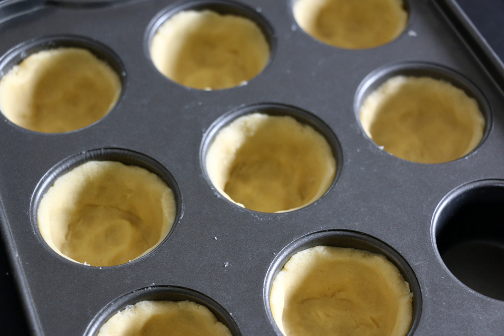 - Dela den stora degen i tio jämnstora bitar, cirka 30g vardera. Rulla dem till bollar och tryck ut dem i en form, gärna med botten man kan trycka upp. Det går också bra med aluminiumformar eller en minimuffinsplåt.
