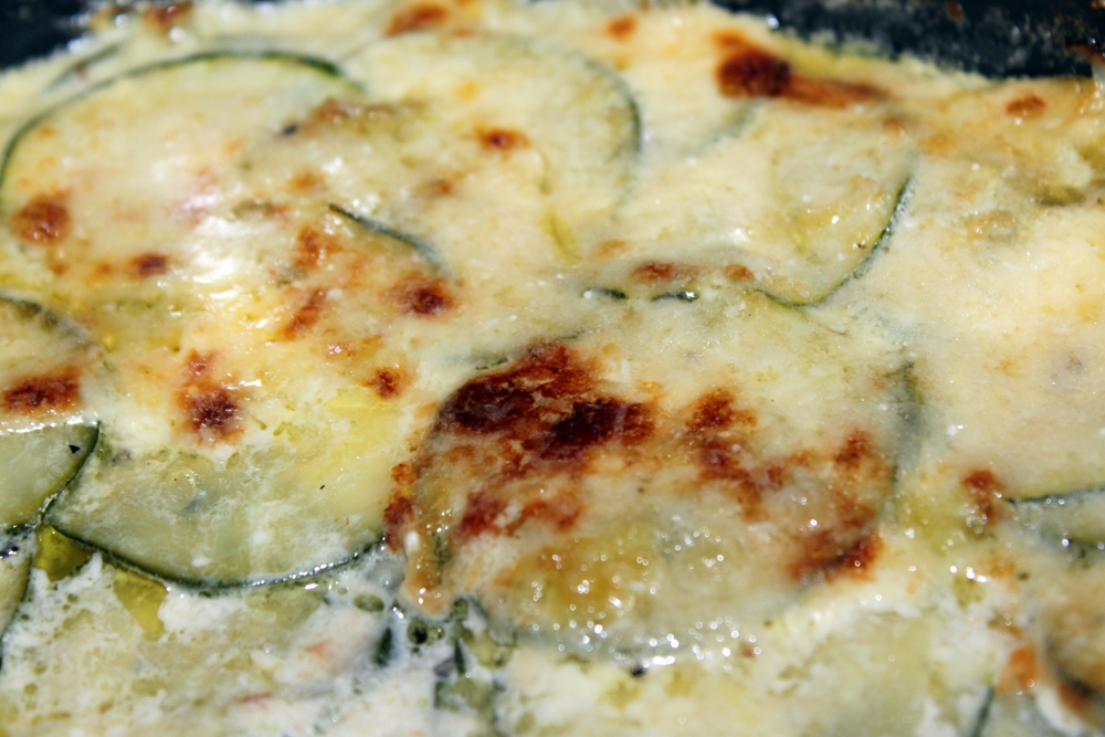 - Lägg ett zucciniskivorna i botten på en ugnsfast form. Häll på parmesangrädden över zuccinin. Strö över den sista parmesanosten och ringla över lite olivolja.