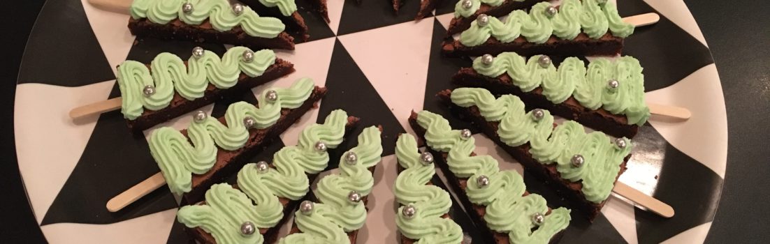 - Dela kladdkakan i 16 bitar. Skär bortkanterna så att du får en rak kant i botten. Om du har miniglasspinnar så sätt i dem i botten på granen som stam.
